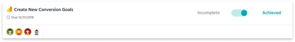 Not all results have to be confined to numerical significance, often success can be defined by a qualitative binary system. An Achievement Key Results allows your team to mark a Key Result as “Incomplete” or “Achieved”.