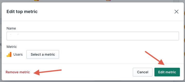 - To Edit or Remove a top metric, click on the metric you'd like to update and use the pop up box to either "Remove metric," "Select a metric" (to change the data) or update the Name/Label.