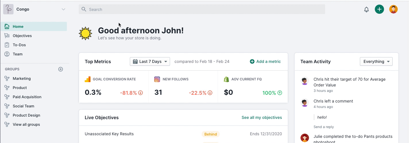 Navigate to the banner at the top of the page. Search for any Objectives, Key Results, To-Dos, or Groups