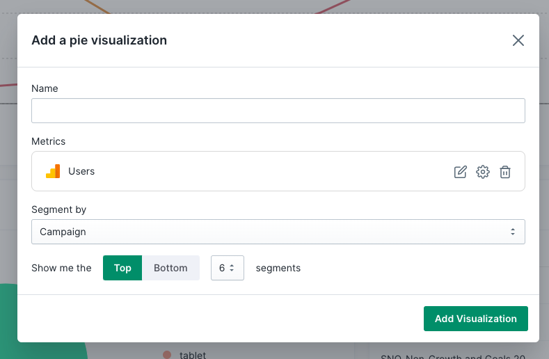 1. Click on the Add Visualization button and select Pie2. Select the metric by clicking the Add Metric button.3. Use the Segment by dropdown to choose select the slices for the pie chart.4. You can choose to see either the top or bottom segments.