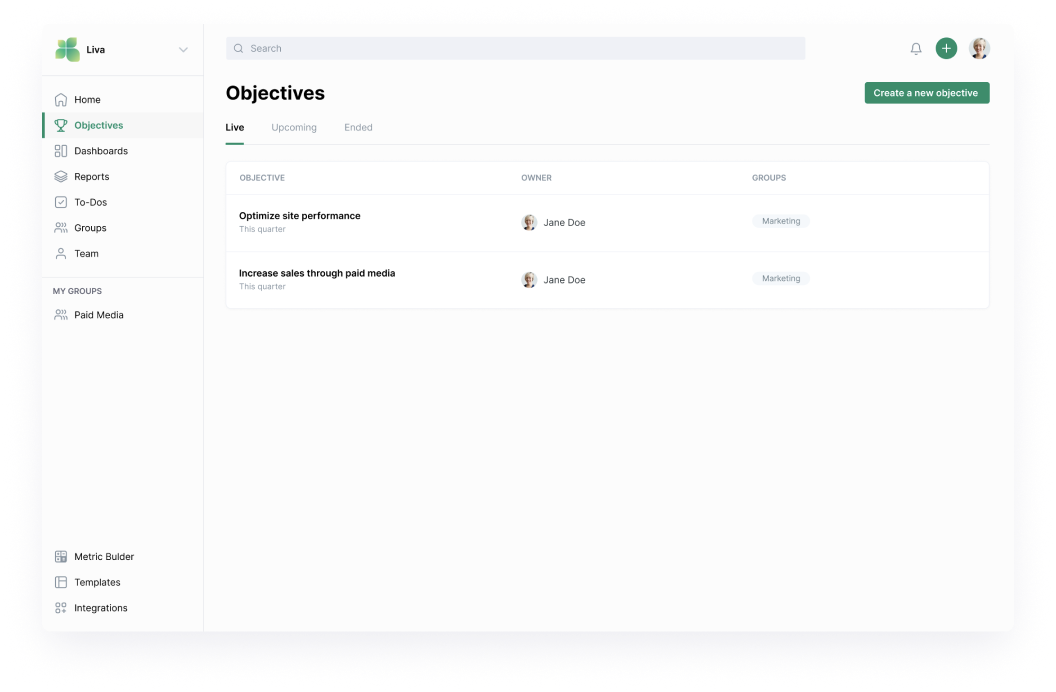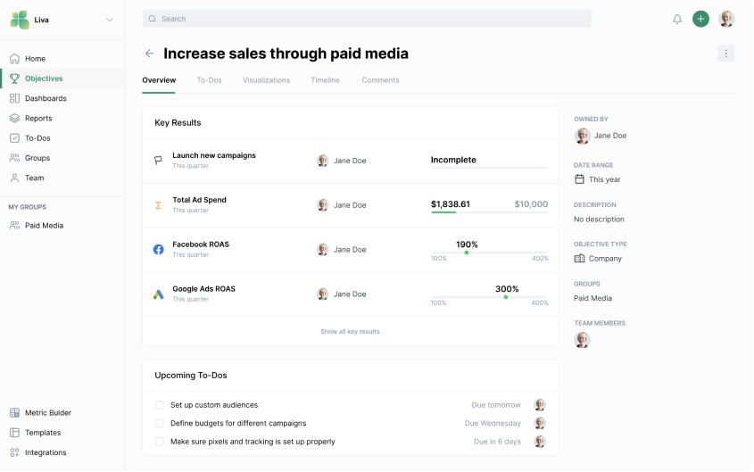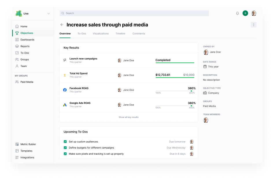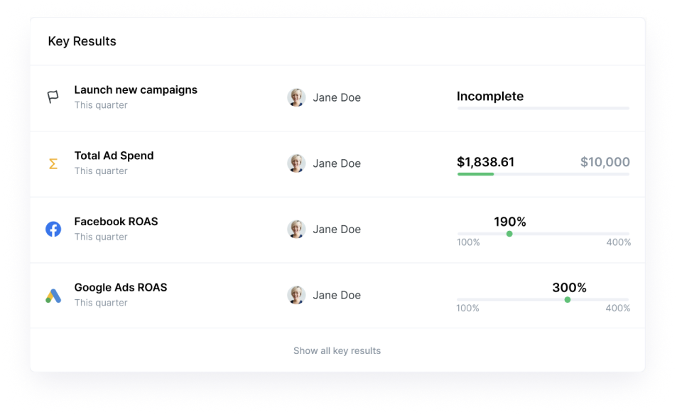Key Results are how your teams track performance and measure results for a greater Objective. This is where you can easily integrate the data from your favorite tools to start working in real-time.