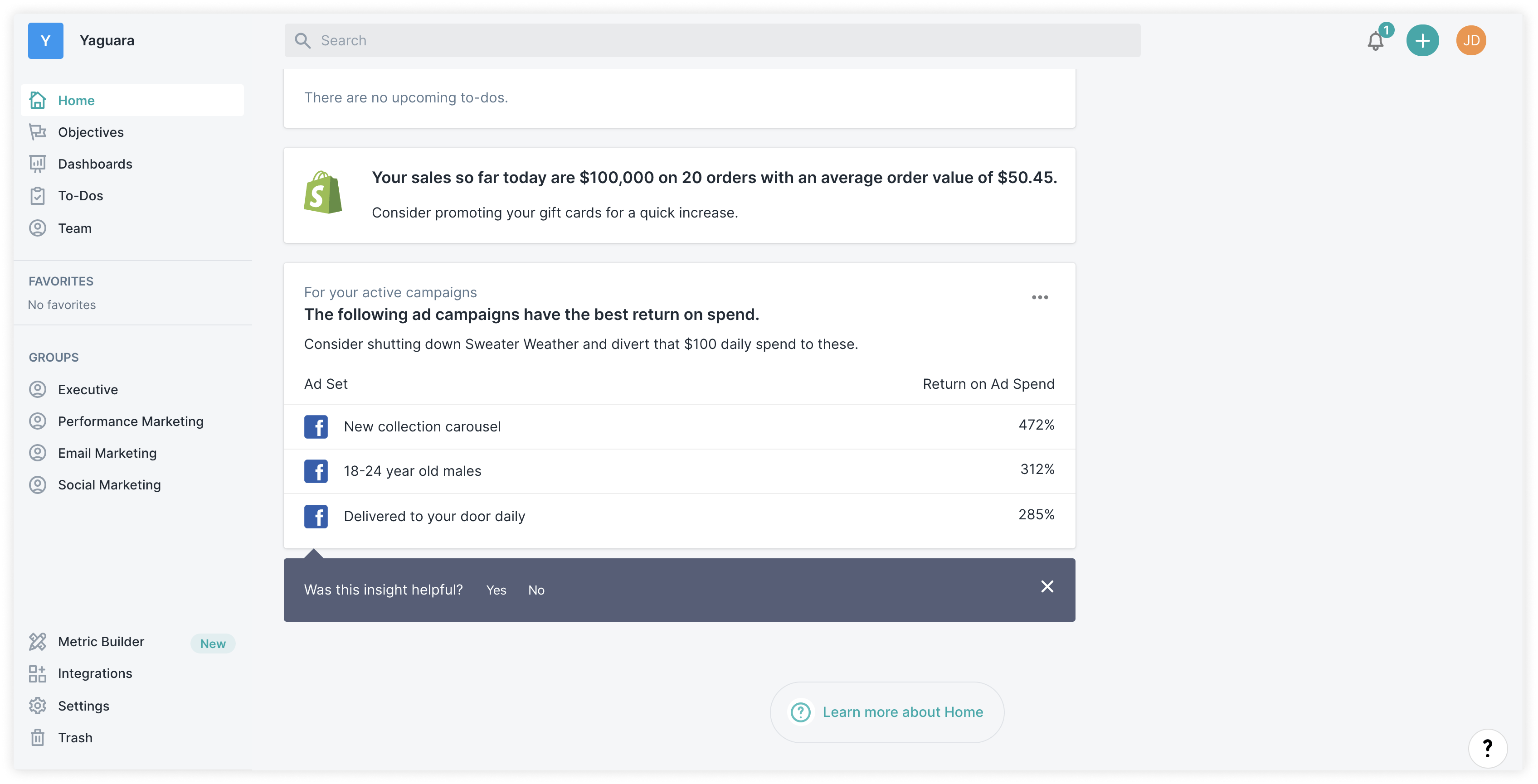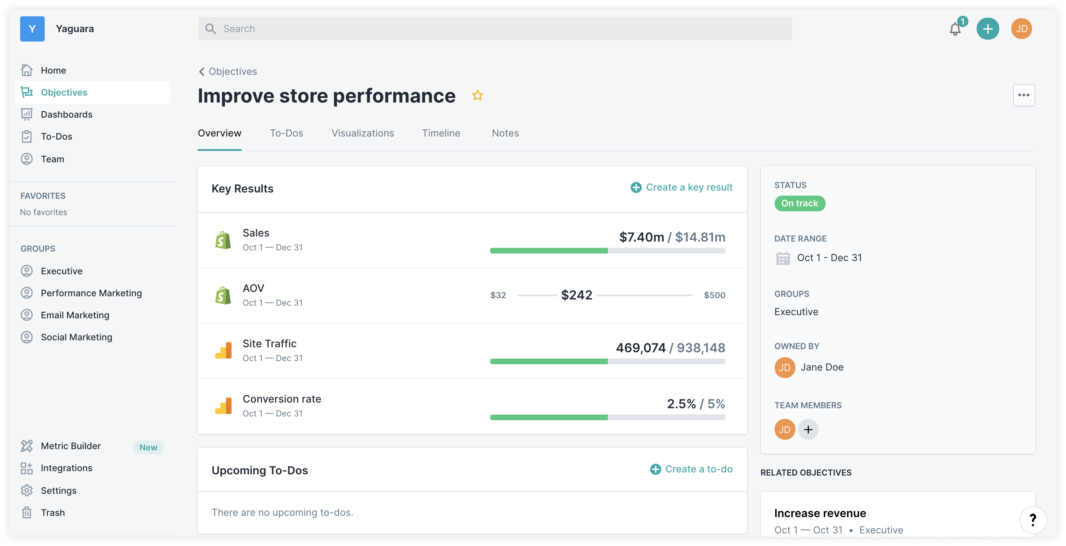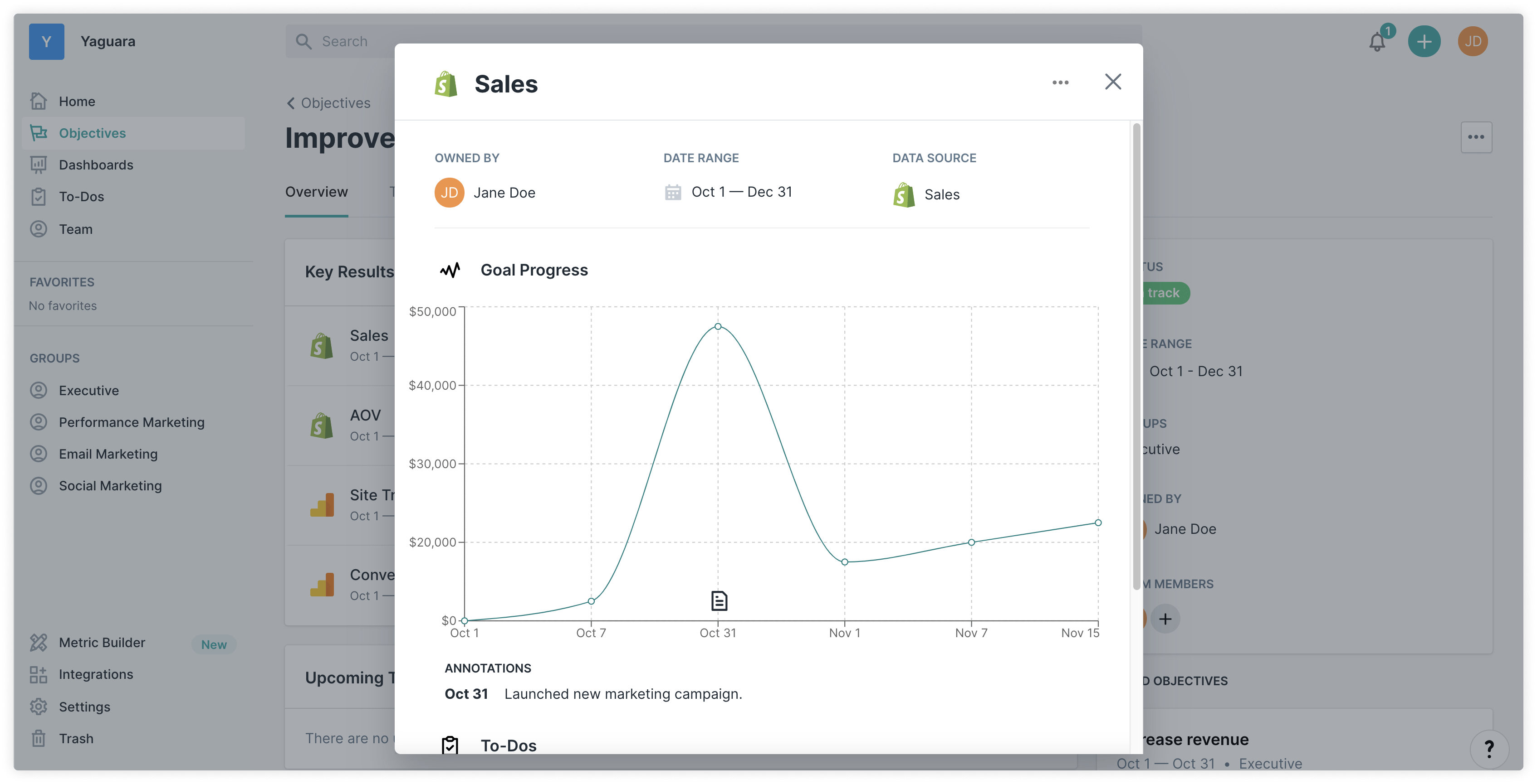 Start by connecting to your team's favorite operational tools, such as Shopify, Google Analytics, and Asana. Then, create your first company-wide or departmental objective based on the metrics you're interested in.