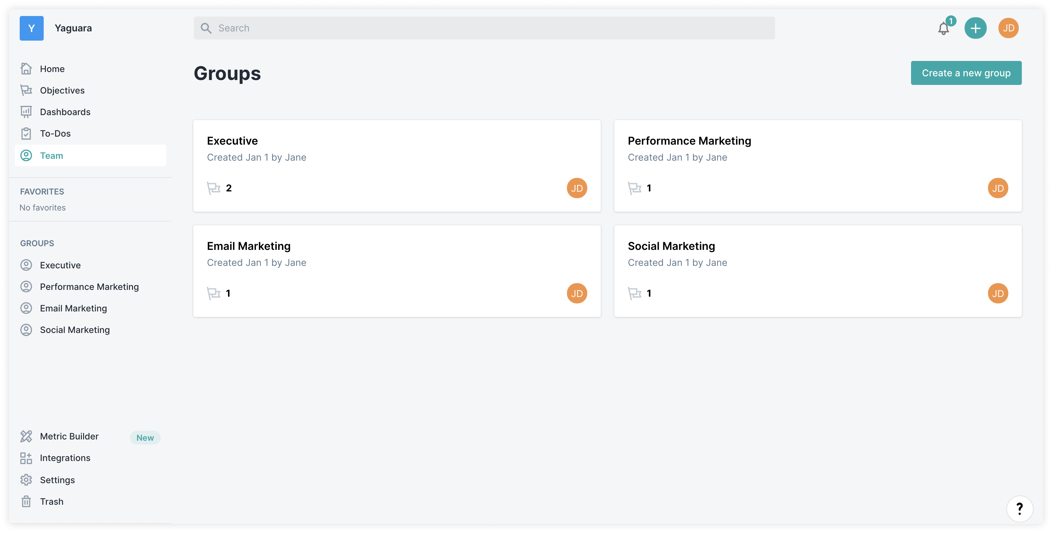 Use Groups to create dashboards for individual teams within your company. You can organize Groups by department, team, or any classification that best represents your model.